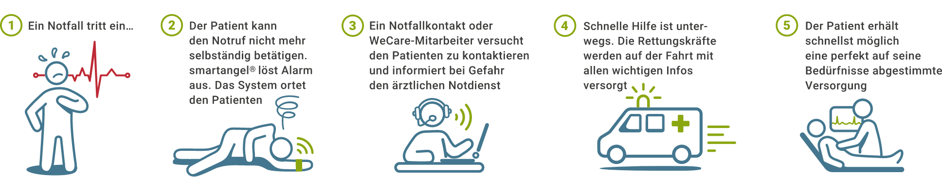 smartangel® arbeitet überaus zuverlässig und warnt bereits frühzeitig vor möglichen gesundheitlichen Problemen. Aber auch unser System kann nicht immer rechtzeitig Alarm schlagen. Sollte es trotzdem einmal zu einem medizinischen Notfall kommen, würde folgendes passieren: